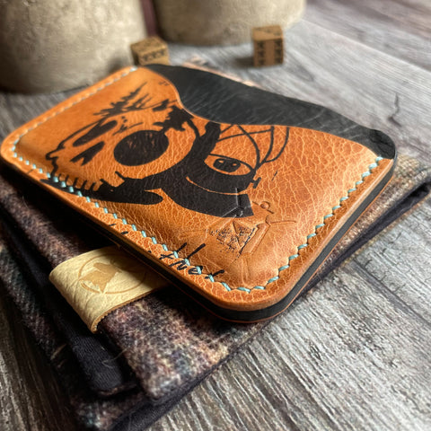 Natural and Navy leather with aqua thread. Stamped with the Numb Skull design.